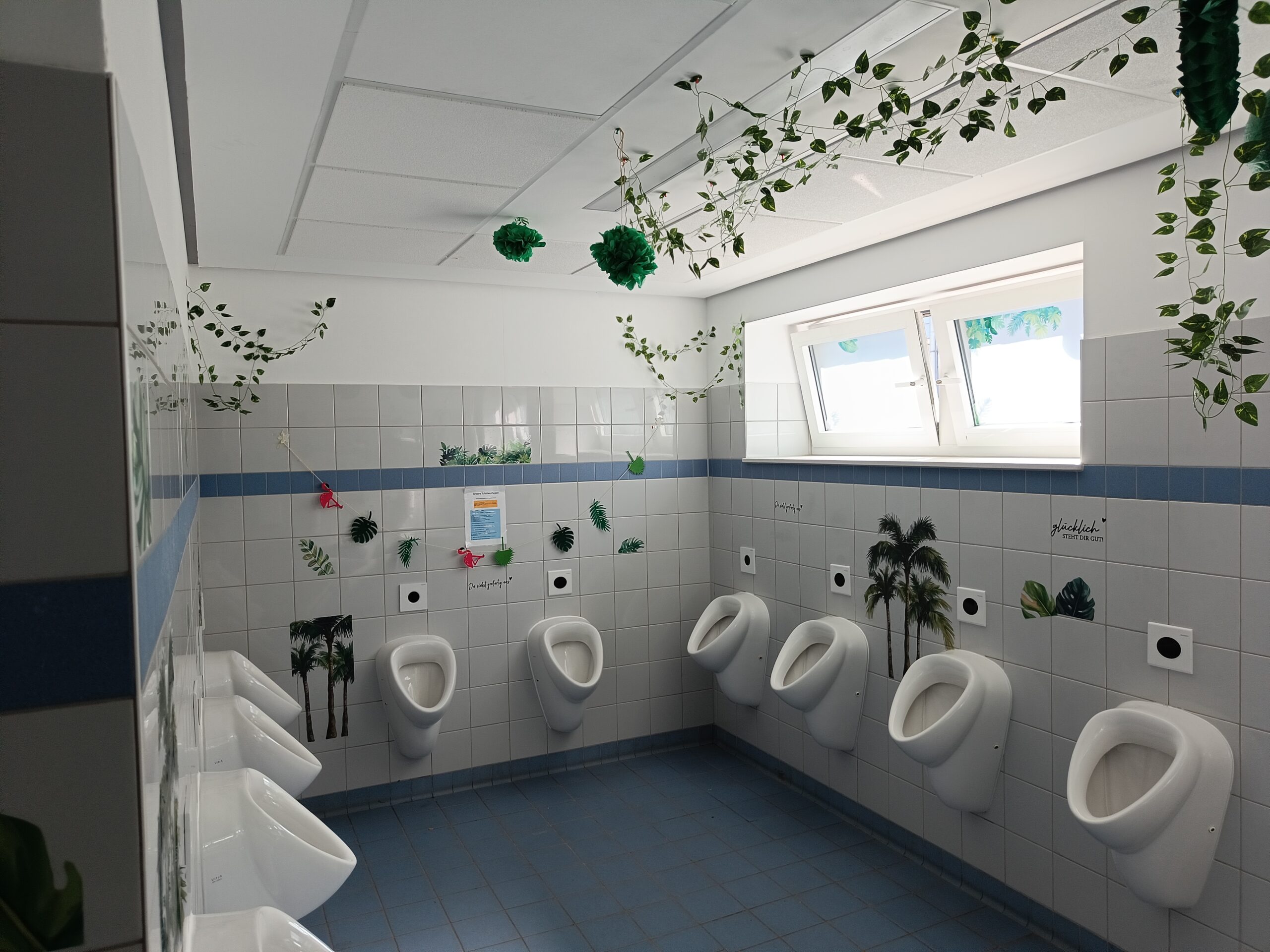 Die Verschönerungsaktion der Toiletten ist offiziell gestartet – und das Ergebnis kann sich wirklich sehen lassen. Dank der gesammelten Spenden haben die Oberschülerinnen und Oberschüler ganze Arbeit geleistet: Mit künstlichen Schlingpflanzen, bunten Papierblumen. Lampions und lustigen Klebefolien wurden sowohl die Mädchen‑ als auch die Jungentoilette in einen kleinen Dschungel verwandelt.